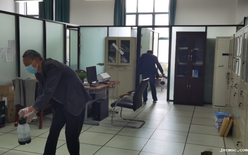 在消杀现场,消杀人员严格规范消杀工作流程,按照比例配好消毒液,以“全覆盖无死角”为原则,对学院区域内的公共环境、办公室、实训室等进行“拉网式”消杀,守牢疫情“安全线”。